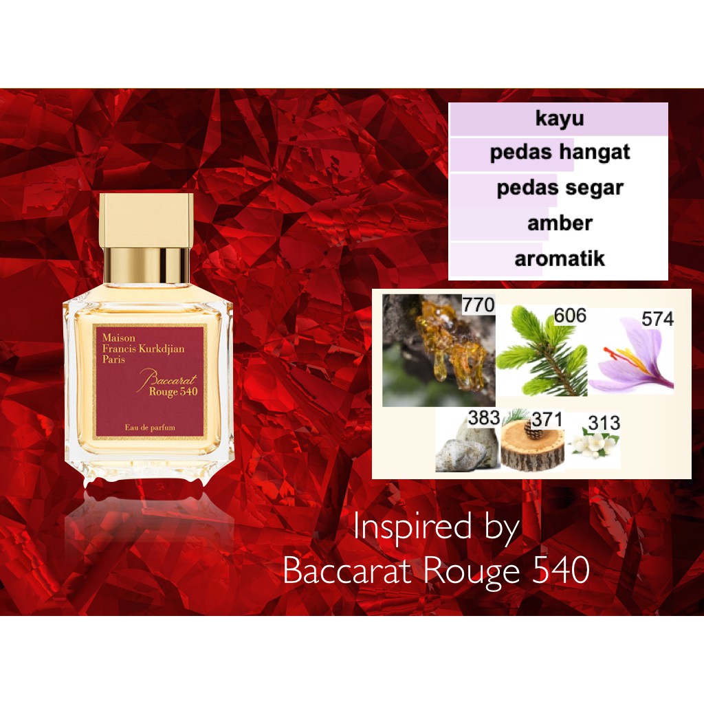Komposisi campuran dengan parfum biasanya 50 50 namun saya menganjurkan 70 bibit parfum. Wangi parfum baccarat rouge 540 top notes campuran melati dan saffron middle notes kombinasi amberwood dan ambergris untuk base notes fir resin dan cedar. Comandă online parfumul preferat.