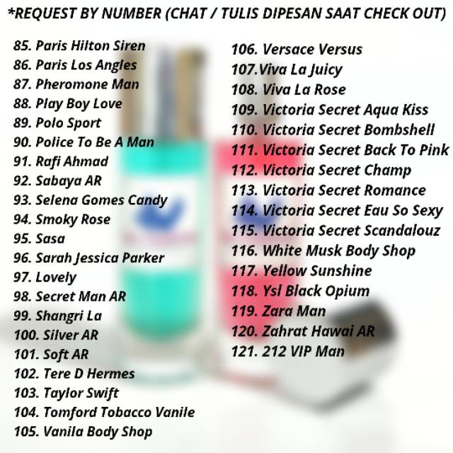 Nama parfum refill aroma vanilla nama nama parfum refill wanita parfum adidas terlaris parfum aroma citrus terbaik parfum axe parfum. Tidak dapat di pungkiri kalau sebuah parfum saat ini sudah menjadi. Demikianlah daftar nama nama aroma parfum refill isi ulang terlaris dan yang paling diminati pelanggan ash shiddiq agency selayar yang diurut rangkingnya berdasarkan jumlah pembeli baik pria ataupun wanita.